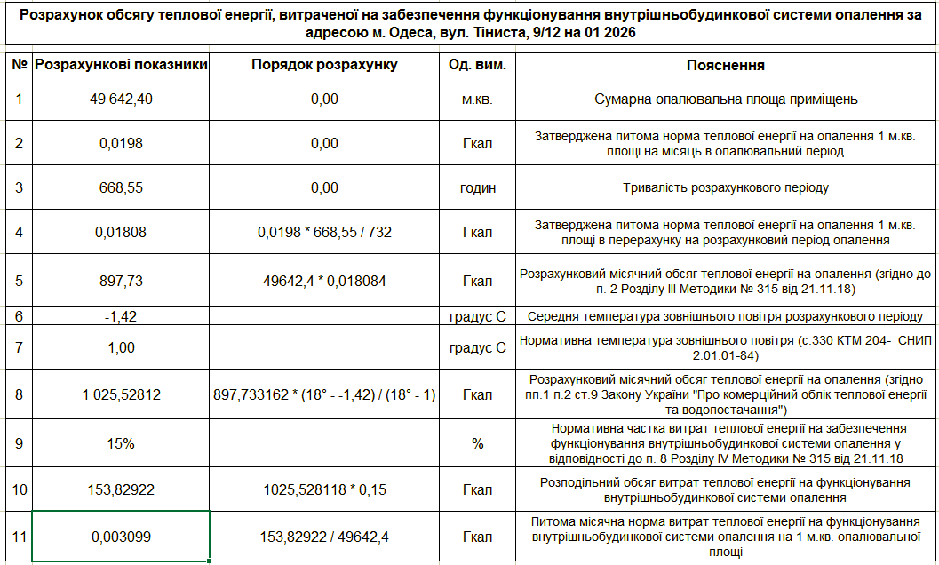 ☝ Розрахунок обсягу теплової енергії, витраченої на забезпечення функціонування внутрішньобудинкових систем опалення за адресою вул. Тіниста 9/12 на січень 2026 р.